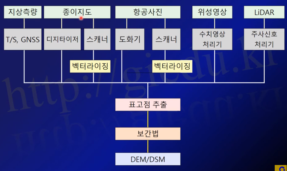 - 수치지형 데이터를 취득하고 취득한 데이터를 GIS 환경에서 사용할 수 있도록 하기 위한 데이터 처리와 이를 바탕으로 다양한 분석 및 응용을 포함하는 일련의 과정
