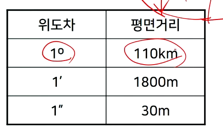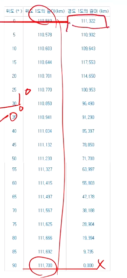 - 경도간의 간격은 위도가 커질수록 작아짐