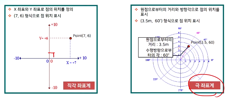 - 원점으로부터의 수평 및 수직 거리를 통하여 위치를 정의하거나 원점으로부터의 거리 및 방향으로 위치를 정의함.