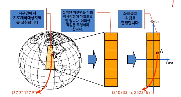 - 일반적으로 접하게 되는 지도상의 지형지물은 2차원 직각좌표계 좌표로 위치정보를 가지고 있음. 이러한 좌표들은 3차원 공간좌표인 측지좌표를 투영(Map Projection)이라는 수학적인 방법을 통하여 2차원으로 변환함을 통하여 계산된 것임.