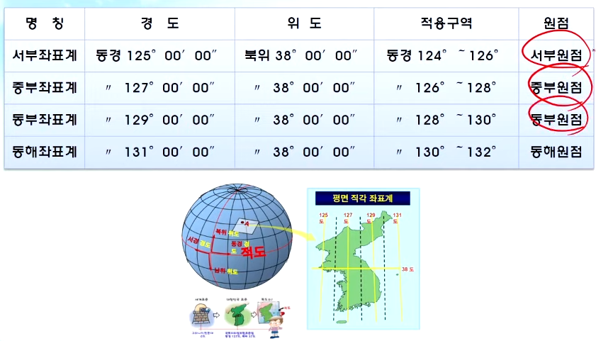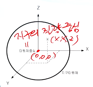 - 원점 : 지구를 타원체로 가정하며, 타원체의 중심을 원점으로 함