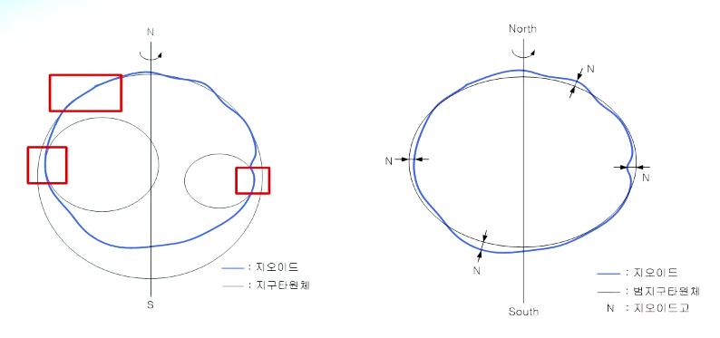 - 지오이드는 지구 내부를 구성하는 밀도분포에 따라 약간의 기복이 있음 (지오이드 = 등포텐셜면)