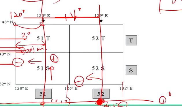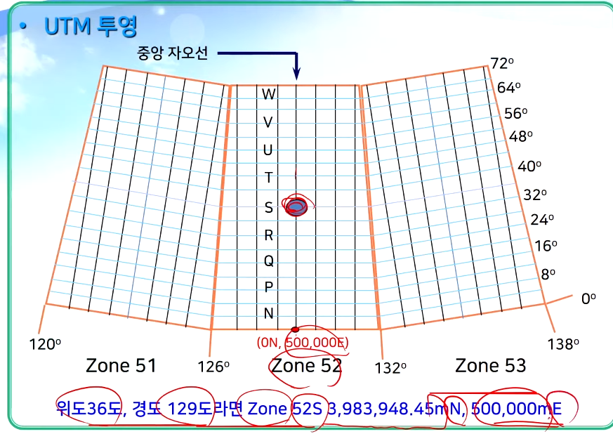 - 우리나라는 51, 52 종대, S, T 횡대에 위치하고 있어, 51S, 51T, 52S, 52T의 4구연(Zone)으로 나타낸다.
