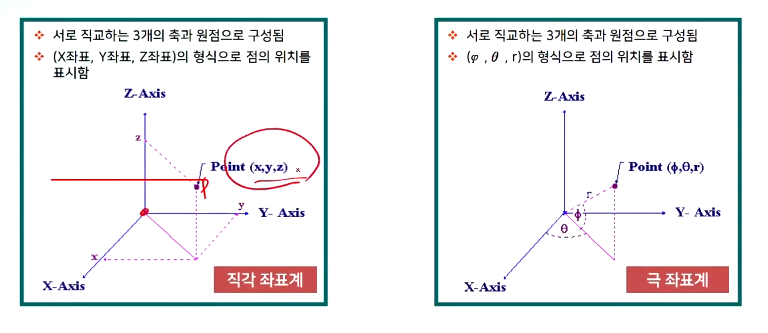 - 3차원 공간에서의 위치 정의를 위해 일반적으로 사용하는 좌표계에는 3차원 직각좌표계와 3차원 극좌표계가 있음