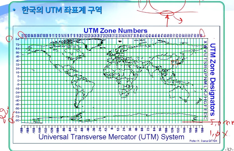 - 경도 : 180˚기준, 6˚간격으로 60등분(1~60 zone)