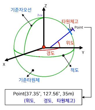 - 3차원 극좌표계의 개념에 지구타원체의 개념을 함께 사용한 타원체 좌표계를 사용함.