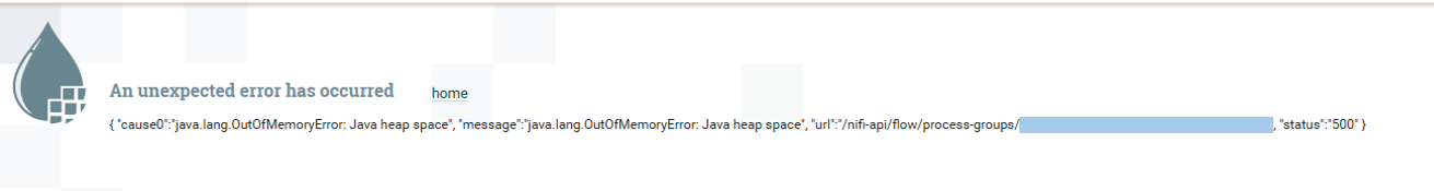 { "cause0":"java.lang.outofmemoryerror: java heap space", "message":"java.lang.outofmemoryerror: java heap space", "url":"/nifi-api/flow/process-groups/d9db24fd-0191-1000-30d0-761e1d6db1d7", "status":"500" }